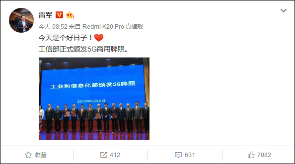 小米集團(tuán)創(chuàng)始人、董事長(zhǎng)兼CEO雷軍在微博上祝賀了5G牌照發(fā)放,并表示“今天是個(gè)好日子”。