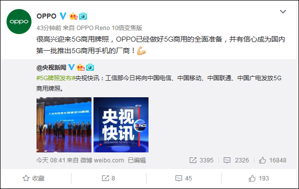 OPPO則表示,很高興迎來(lái)5G商用牌照,OPPO已經(jīng)做好5G商用的全面準(zhǔn)備,并有信心成為國(guó)內(nèi)第一批推出5G商用手機(jī)的廠商!