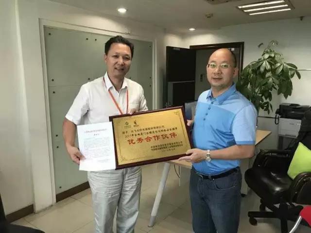 中國(guó)移動(dòng)福建公司采購部總經(jīng)理林志強(qiáng)(右)為長(zhǎng)飛公司頒發(fā)獎(jiǎng)牌