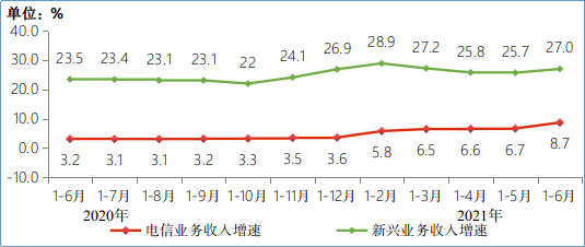 圖2 2020-2021年1-6月電信業(yè)務(wù)收入分類增長情況
