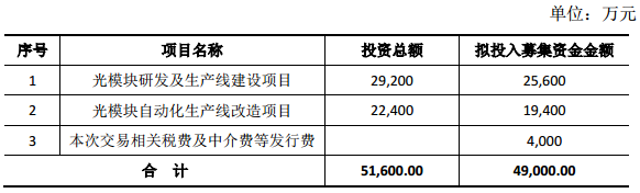 與此同時,上市公司擬募集配套資金,總額將不超過4.9億元,募集配套資金擬用于蘇州旭創(chuàng)光模塊研發(fā)及生產(chǎn)線建設(shè)項目、光模塊自動化生產(chǎn)線改造項目等,具體情況如下: