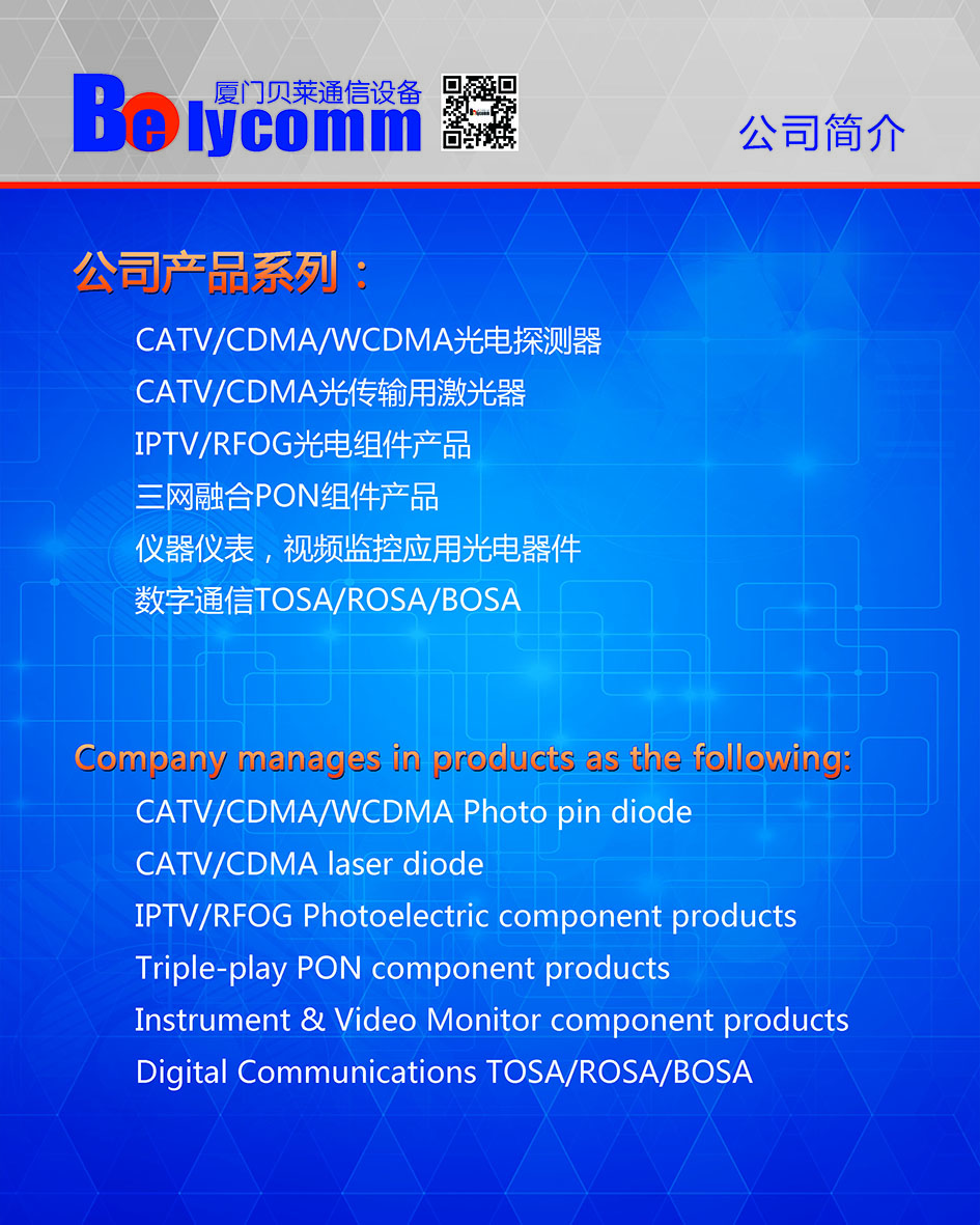 廈門市貝萊通信設(shè)備有限公司成立于2004年,廠房位于廈門市火炬高科技園區(qū),主要從事光纖通信領(lǐng)域,特別是CATV光纖傳輸領(lǐng)域和CDMA光纖直放站的各種光有源器件、光無源器件和網(wǎng)絡(luò)設(shè)備的開發(fā)、生產(chǎn)和銷售。貝萊通信是國家認(rèn)定的高薪技術(shù)企業(yè),擁有十幾項(xiàng)的實(shí)用新型專利。