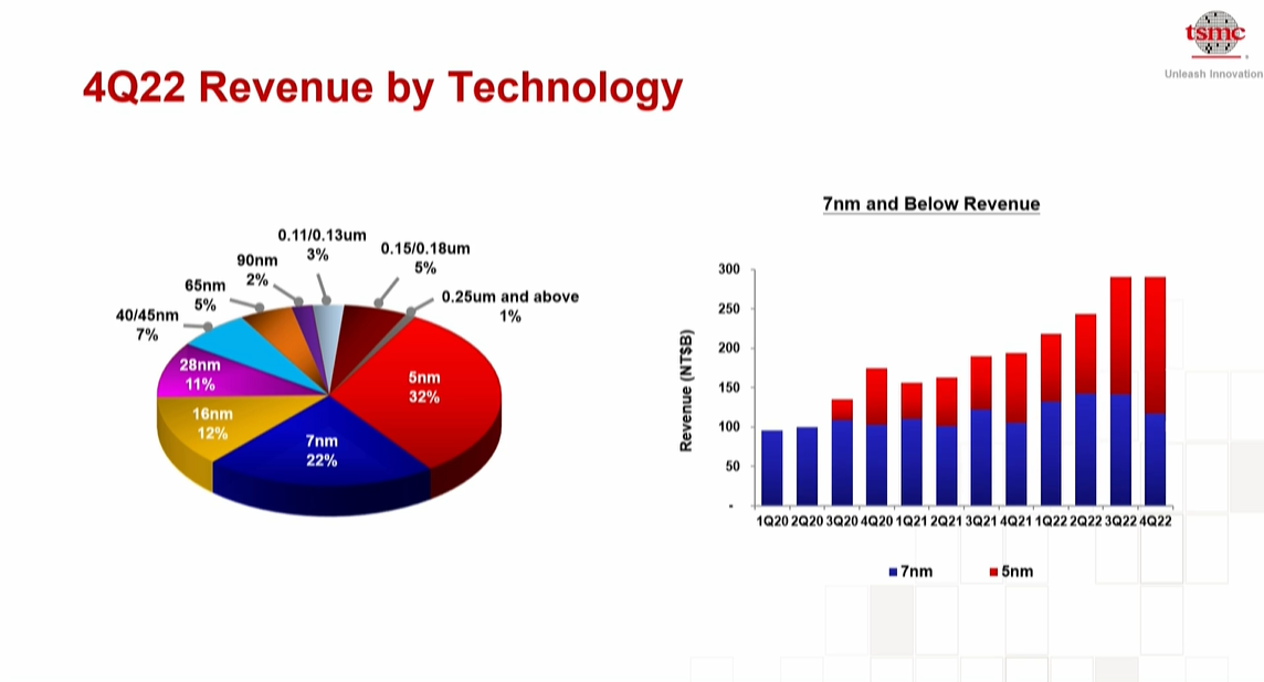 以制程來分,第四季度臺積電7納米制程占晶圓總收入約22%,5納米制程比重約32%。包括7納米及5納米先進制程比重約54%。另外,16納米12%,28納米11%。