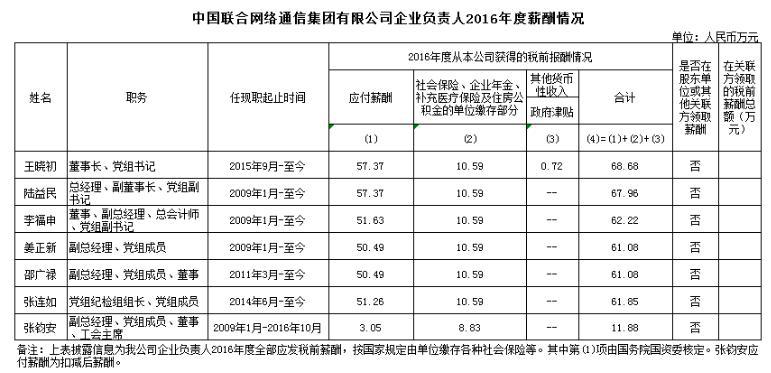 中國聯(lián)通共公布了7位高管的薪酬情況,收入共計為394.75萬元,平均薪酬為56萬元,仍遠低于中國電信和中國移動。收入最高的為中國聯(lián)通董事長王曉初,68.68萬元。中國聯(lián)通副董事長、總經(jīng)理陸益民以67.96萬元次之,其余的數(shù)名高管薪酬則是分布在11萬元--62萬元之間。
