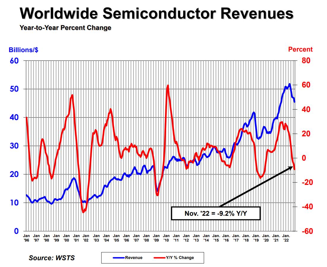 ICC訊 美國半導(dǎo)體產(chǎn)業(yè)協(xié)會(SIA)1月9日宣布,2022年11月全球半導(dǎo)體行業(yè)銷售額為455億美元,較2022年10月的469億美元減少2.9%,比2021年11月的500億美元減少9.2%,同比降幅達到自2019年12月以來的新高。