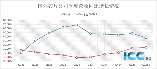 據(jù)ICC統(tǒng)計,9家半導(dǎo)體公司在截至2025年3月末/4月末的財季總營收為613.74億美元,同比增長47.49%。不包含英偉達(dá)的8家總營收為173.12億美元(其中博通只計入其半導(dǎo)體營收),同比增長12.00%。