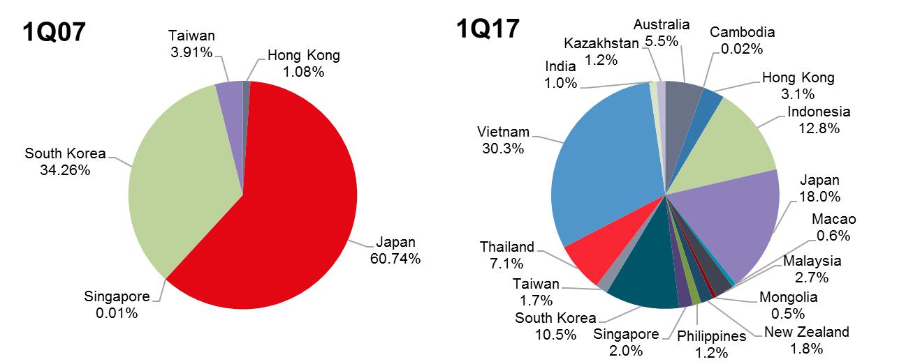 日本引領(lǐng)2007年,中國和越南將在2017年引領(lǐng)用戶數(shù)增長