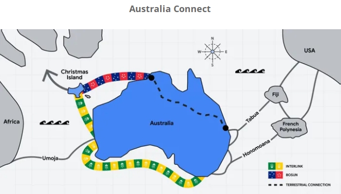 澳大利亞連接將由兩個光纜系統(tǒng)組成:Bosun海底光纜將連接澳大利亞的達(dá)爾文和圣誕島,然后再連接到新加坡,而新的互連光纜將連接墨爾本、珀斯和圣誕島。