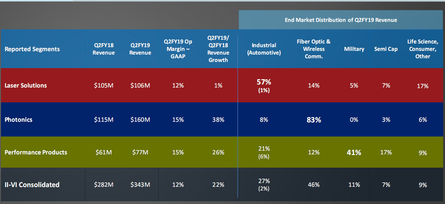 ICCSZ訊 工程材料及光電器件制造商II-VI公司公布其2019財(cái)年第二季度營收3.43億美元,同比增長22%,其中Laser Solutions營收1.06億美元,同比增長1%;Photonics營收1.6億美元,同比增長38%;Performacne Products營收7700萬美元,同比增長26%。2019財(cái)年上半年,II-VI實(shí)現(xiàn)訂單收入7.04億美元,營業(yè)收入6.57億美元。
