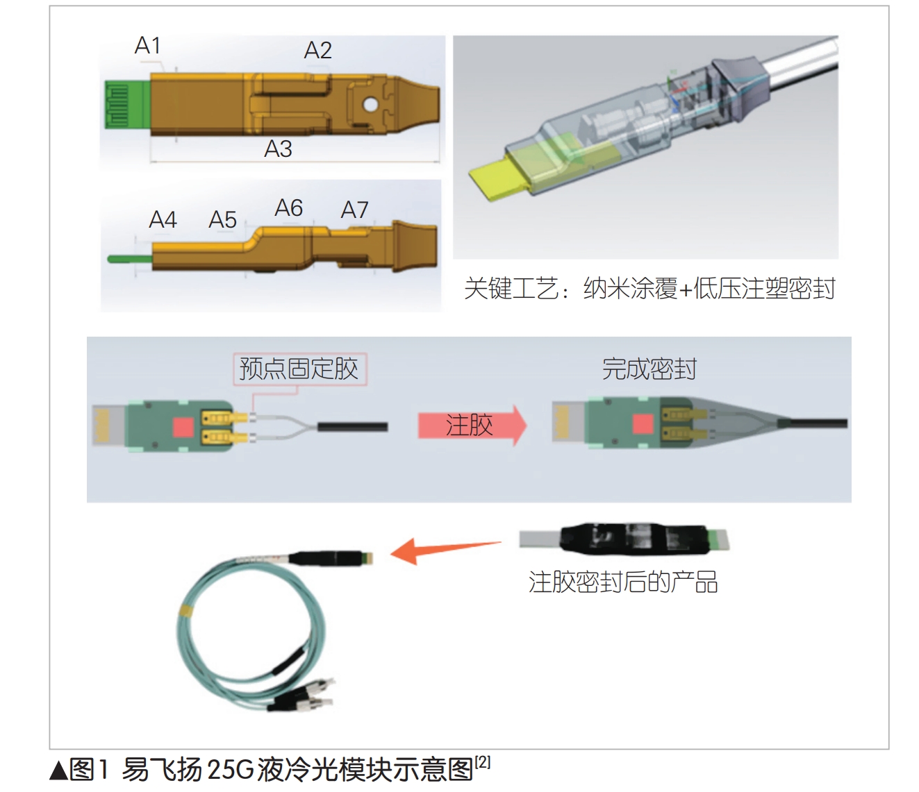 當數(shù)據(jù)中心中采用浸沒或者噴淋式液冷系統(tǒng)時,板上芯片封裝 (COB) 工藝的光模塊在液體環(huán)境中無法直接使用。在液冷數(shù)據(jù)中心中宜使用蝶形封裝BOX和同軸封裝TO-CAN 兩種氣密性封裝光組件,并進行模塊的整體液密封裝,或者對光電部分 COB 封裝的光模塊進行全塑封設(shè)計 (液密封裝),以有效防止液冷環(huán)境中的冷卻液對光模塊光路部分造成干擾。圖1展示了易飛揚液冷光模塊的密封工藝,該工藝主要通過納米涂覆和低壓注塑密封實現(xiàn)[2] 。