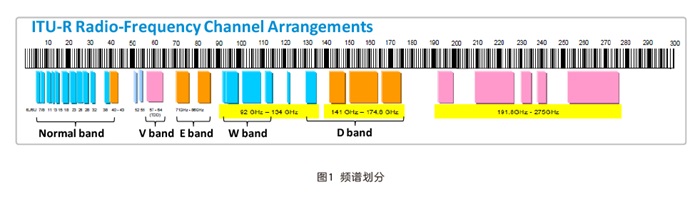 通常把低于42GHz的頻譜稱為常規(guī)頻段,把57GHz~66GHz之間的頻譜稱為V-Band,把71GHz~76GHz/81GHz~86GHz之間的頻譜稱為E-Band,業(yè)界對(duì)于W-Band和D-Band還沒有統(tǒng)一的標(biāo)準(zhǔn)定義。目前W-Band泛指100GHz左右的頻譜,比如從92GHz~115GHz,而D-Band泛指130GHz~175GHz頻率范圍(見圖1)。