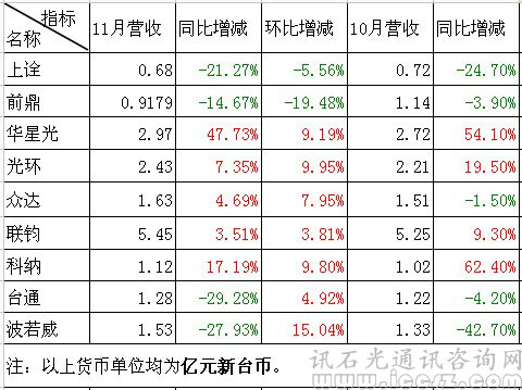 如上圖,華星光、光環(huán)依然同環(huán)比均漲,今年下半年以來,華星光、光環(huán)不受大環(huán)境影響,依舊漲勢(shì)喜人。光環(huán)11月營收2.4億元,環(huán)比增長10%,同比增長7.3%。華星光通11月營收2.9億元,環(huán)比增長9%,同比增長47.7%,為歷史新高。而上詮、前鼎、臺(tái)通、波若威等無源廠商則不太樂觀。