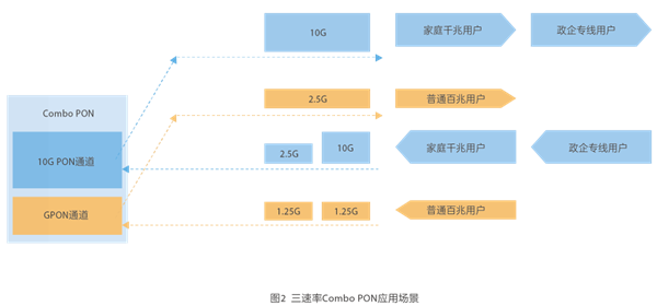 三速率Combo PON可以按需接入XGS-PON、XG-PON和GPON三種類型的ONU,靈活滿足運營商不同客戶的需求:XGS-PON可用于政企專線用戶接入,XG-PON可用于家庭千兆用戶接入,GPON則用于普通百兆用戶接入。