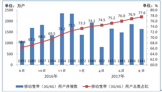 圖3 2016-2017年8月移動寬帶用戶當月凈增數和總數占比情況