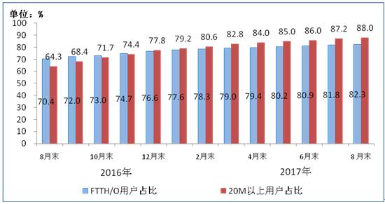 圖4 2016-2017年8月光纖接入(FTTH/O)和20Mbps及以上固定寬帶接入用戶占比情況
