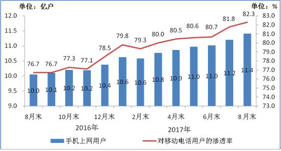 圖5 2016-2017年8月手機上網用戶和對移動電話用戶滲透率情況