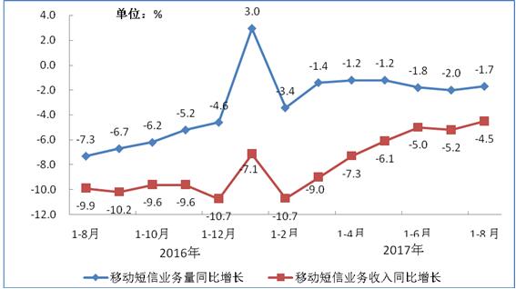 圖7 2016-2017年8月移動短信業(yè)務量和收入同比增長情況