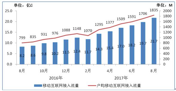 圖8 2016-2017年8月當月移動互聯網接入流量和戶均流量比較