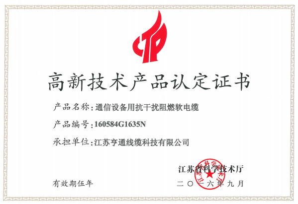 亨通線纜)的三項(xiàng)新品“通信設(shè)備用抗干擾阻燃軟電纜” 、“鎧裝屏蔽型抗干擾數(shù)據(jù)電纜”、“雙金屬屏蔽軌道交通信號通信電纜”,成功通過江蘇省高新技術(shù)產(chǎn)品認(rèn)證,獲得高新技術(shù)產(chǎn)品認(rèn)證證書。