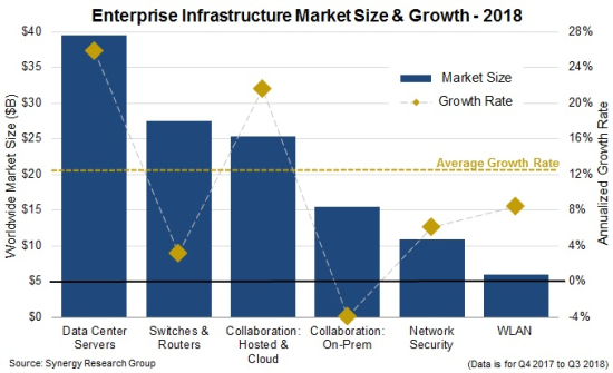 ICCSZ訊(編譯:Nina)Synergy Research的新數(shù)據(jù)顯示,截至2018年第三季度的滾動四季度,全球企業(yè)基礎設施市場(包括數(shù)據(jù)中心服務器、交換機&路由器、托管&云協(xié)作、本地部署協(xié)作、網(wǎng)絡安全和WLAN六個板塊)年增幅近13%,總收入達到了1250億美元。