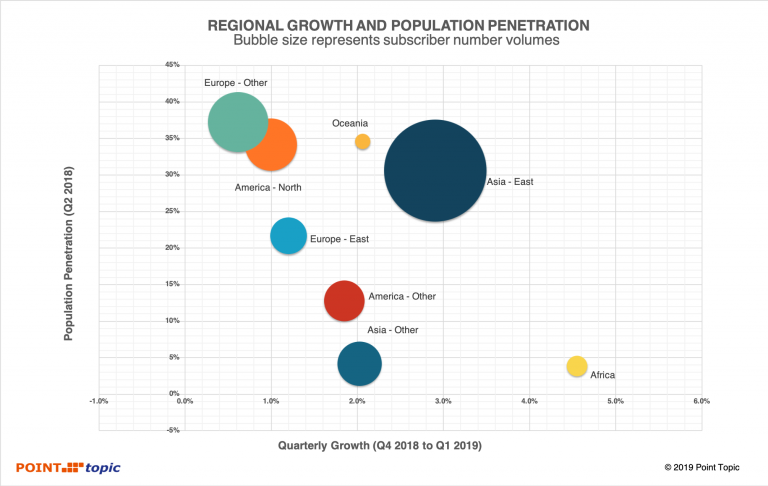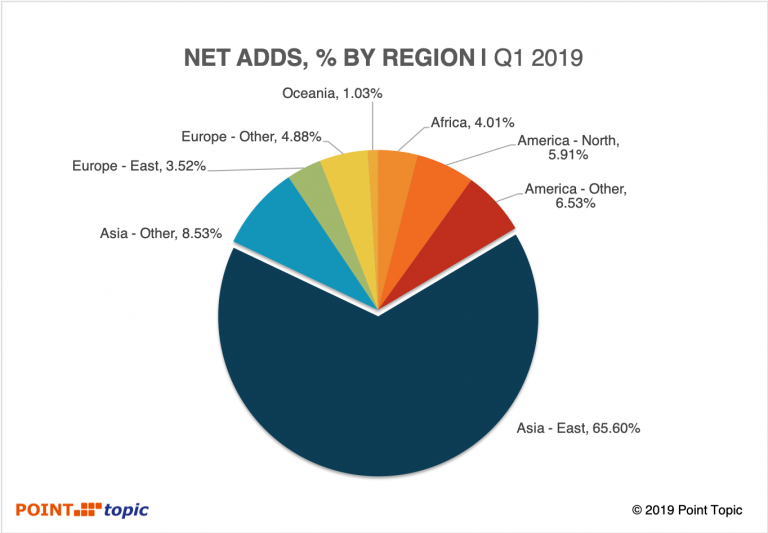 固定寬帶用戶中超過65%的凈增加來自東亞(圖3),這也使所有用戶中最大的區(qū)域市場份額保持在47%(圖4)。 與2018年第四季度相比,所有地區(qū)的市場份額變化不到一個(gè)百分點(diǎn)。