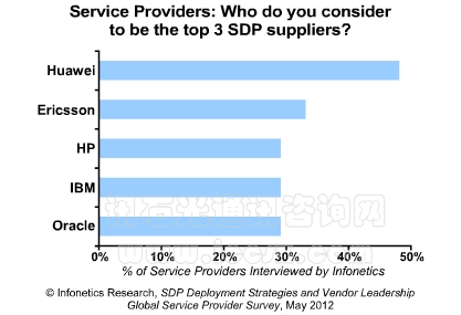 在一份開放式問題調(diào)查中,當(dāng)請他們列舉前三大SDP設(shè)備商時,運營商大多都認為是華為、愛立信、惠普、IBM和甲骨文(在Infonetics 2011 SDP調(diào)查中居首。)