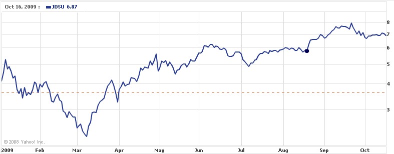 摘要:JDSU公司近日宣布將于近期舉行2009年度股東大會(huì),具體時(shí)間為美國(guó)西部時(shí)間11月11日上午九點(diǎn)。這家數(shù)據(jù)網(wǎng)通設(shè)備制造商過(guò)去1個(gè)月股價(jià)小跌,但是今年來(lái)大漲87%。