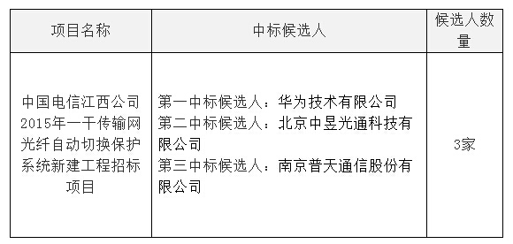 ICCSZ訊(編輯:Debi)昨天,官方公布中國電信江西公司2015年一干傳輸網(wǎng)光纖自動切換保護(hù)系統(tǒng)新建工程招標(biāo)項目中標(biāo)候選人,其中,華為、北京中昱光通、南京普天分別為第一、二、三中標(biāo)候選人。具體信息如下: