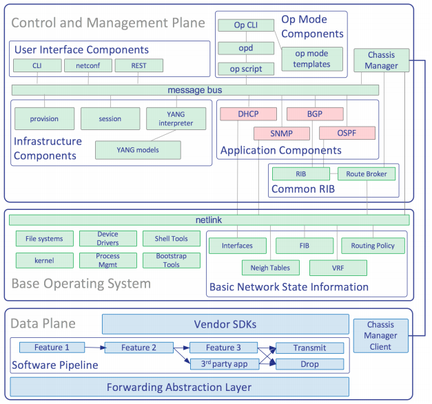 AT&T表示,其全球網(wǎng)絡(luò)包括來自供應(yīng)商的超過10萬個互連的IP/MPLS路由器。這些OEM路由器是作為單片路由器平臺設(shè)計,開發(fā)和銷售的,具有垂直集成的專有硬件和軟件組件。但是AT&T的白盒應(yīng)用計劃將會脫離傳統(tǒng)的路由器,轉(zhuǎn)而采用白盒。DNOS白皮書以DPDK等軟件的發(fā)展和YANG模型的發(fā)展,以及商用芯片和可編程語言P4的發(fā)展,闡述了采用開放軟硬件平臺的必要性,以及業(yè)界對標(biāo)準(zhǔn)的NOS的需求。