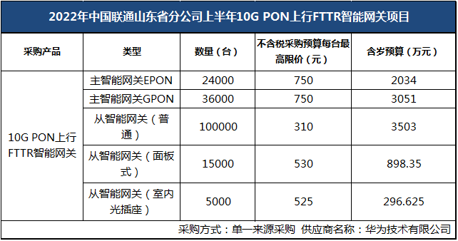 ICC訊 11月19日消息,山東聯(lián)通發(fā)布2022年上半年10G PON上行FTTR智能網(wǎng)關(guān)項(xiàng)目單一來源采購公示項(xiàng)目,擬采購各類型10G PON上行FTTR智能網(wǎng)關(guān)合計(jì)18萬臺(tái)。具體需求、最高限價(jià)和含稅預(yù)算如下: