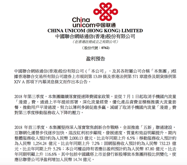 中國(guó)聯(lián)通2018年前三季度業(yè)績(jī)預(yù)告:凈利87.8億 同比增長(zhǎng)116.6%