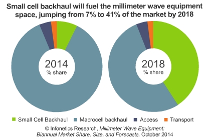 * Infonetics預(yù)測,戶外small cell回程毫米波設(shè)備增長率將超過市場的其它細(xì)分部分,預(yù)計(jì)其2013年至2018年的復(fù)合年增率為101%。
