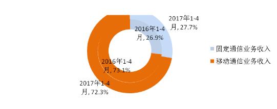 圖2 2017年1-4月電信業(yè)務(wù)收入結(jié)構(gòu)占比情況(固定和移動)