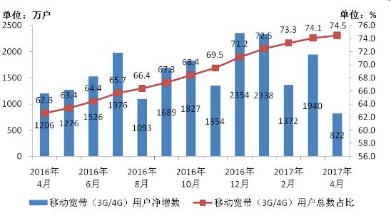 圖3 2016-2017年4月移動寬帶用戶當(dāng)月凈增數(shù)和總數(shù)占比情況
