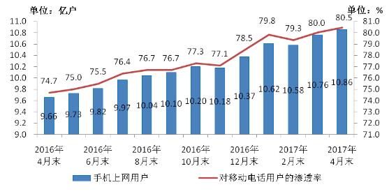 圖5 2016-2017年4月手機上網(wǎng)用戶和對移動電話用戶滲透率情況