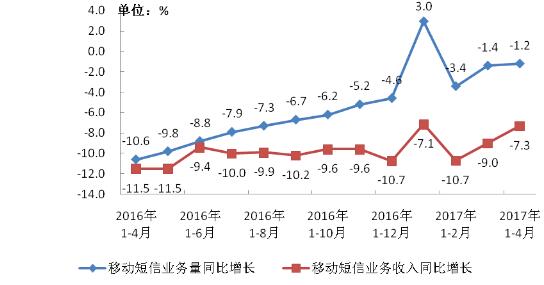 圖7 2016-2017年4月移動短信業(yè)務(wù)量和收入同比增長情況