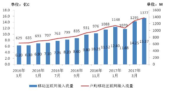 圖8 2016-2017年4月當(dāng)月移動互聯(lián)網(wǎng)接入流量和戶均流量比較