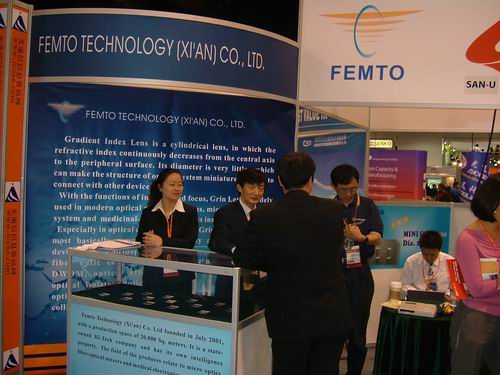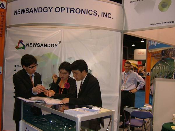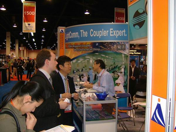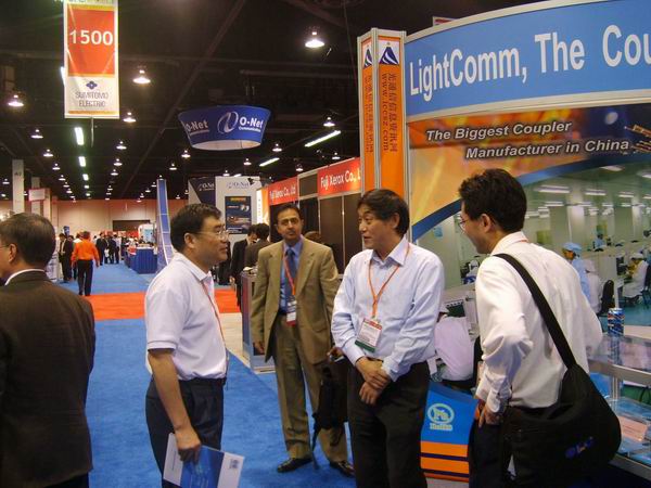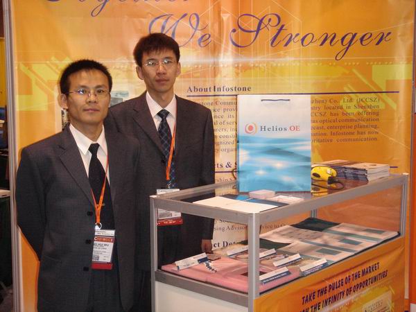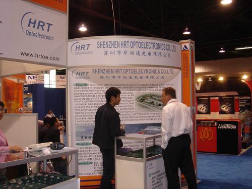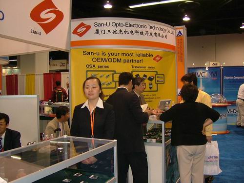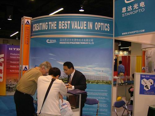相對于其他展團,訊石充滿活力的金黃色標識似乎更加吸引人注意。 作為在國內外光通訊行業(yè)有一定知名度的器件供應廠商,在此次展會上,三優(yōu)光電重點推薦mini TO-CAN、APD、APD-TIA、ONU、SFP、單纖雙向模塊等特色產(chǎn)品。 深圳思達光電展臺盧總正在向國外客戶介紹公司新產(chǎn)品:各種速率、不同封裝的光有源模塊產(chǎn)品。