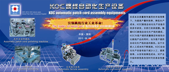 【訊石光通訊咨詢網(wǎng)】 2012年9月7日,訊石記者對深圳嘉萬光通信有限公司進行了專訪。走進潔白方正的展臺,一副巨大的KOC(深圳嘉萬)跳線自動化生產(chǎn)設(shè)備背景圖畫跳入眼簾,十分醒目。嘉萬夏總告訴訊石記者,這是公司新推出的KOC跳線自動化生產(chǎn)設(shè)備。這一設(shè)備是在成本及質(zhì)量競爭激烈的市場背景下,為提高產(chǎn)量和效率、降低生產(chǎn)成本而研制的,目前已初具規(guī)模。隨著KOC跳線自動化生產(chǎn)線的建成,KOC將會為客戶提供質(zhì)量更為穩(wěn)定,性價比更高的跳線產(chǎn)品,為客戶提供自動化生產(chǎn)線改造服務(wù)。