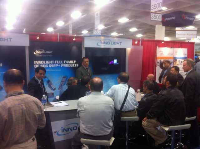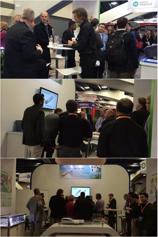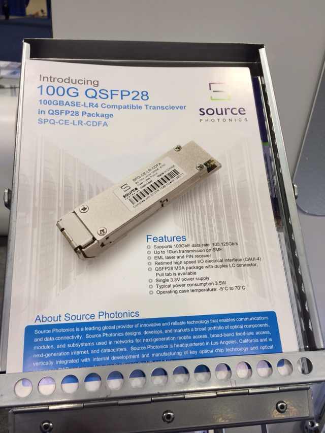 國內(nèi)光迅本次參展將重點展示企業(yè)在智能光網(wǎng)絡(luò)、100G、數(shù)據(jù)和FTTH方面推出的解決方案,其中就有100G。Avago展示其專為現(xiàn)代數(shù)據(jù)中心和企業(yè)網(wǎng)絡(luò)應(yīng)用而設(shè)計的新一代100G光收發(fā)模塊解決方案---Avago 100G QSFP28 SR4和100G CFP4 LR4。Source展示QSFP28外形的100G-LR4光收發(fā)器。NeoPhotonics展示于光子集成PIC技術(shù)的100Gbps集成相干發(fā)射器ICT。ColorChip展示一款用于數(shù)據(jù)中心、高性能計算和企業(yè)應(yīng)用的100-Gbps(4x25 Gbps) 高速光收發(fā)器。以色列新興高速光模塊廠商Effdon計劃展示一系列100Gbps收發(fā)器。富士通也將展出其新開發(fā)的應(yīng)用于高速數(shù)據(jù)傳輸?shù)乃耐ǖ佬⌒涂刹灏?QSFP28)有源光纜(AOC),該產(chǎn)品是世界上首款使用多模光纖傳輸技術(shù)的100Gbps有源光纜(25Gbps*4通道)。等等這些無一不說明100G指引著本屆OFC的技術(shù)方向。