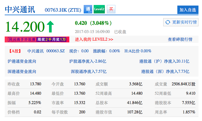 中興通訊是內(nèi)地和香港兩地上市公司,期間港股并未停牌,昨日中興通訊港股(00763.HK)在大盤整體下跌的大環(huán)境下逆勢上漲,漲幅一度超過5%,截止收盤漲幅為3.048%;自3月8日至今,中興通訊港股累計漲幅為16.39%,顯示出資本市場對于中興通訊經(jīng)過調(diào)整后未來前景的看好。