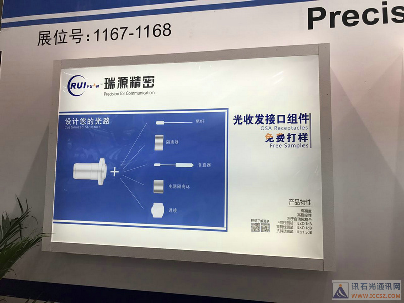 Iccsz訊(編輯:Aiur) 9月8日,CIOE2017進(jìn)入第三天,1號(hào)館光通訊展依舊熙熙攘攘,訊石繼續(xù)拜訪會(huì)員單位。在光通訊中,OSA性能的好壞受到多少方面因素影響,其中光收發(fā)接口組件Receptacle是影響光耦合的關(guān)鍵。國(guó)內(nèi)具備高精度、高穩(wěn)定性的光組件廠商并不多,江西瑞源精密制造有限公司便是高質(zhì)量Receptacle產(chǎn)品代表之一。