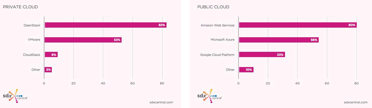 不論是部署規(guī)模還是應(yīng)用比例,2017年比2016年都有所提升,這表明SDN在2017年里面,是處于一個(gè)正向發(fā)展的趨勢(shì)。而SDN的發(fā)展,得益于云計(jì)算和軟件定義數(shù)據(jù)中心(SDDC)的發(fā)展。接下來(lái)看看SDN產(chǎn)品與云平臺(tái)的集成情況。在被問(wèn)及SDN期望與什么云平臺(tái)做集成時(shí),私有云絕大多數(shù)選擇了OpenStack,而公有云絕大多數(shù)選擇了AWS。