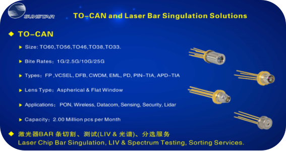 1G-25G DML, EML TO-CAN設(shè)計、生產(chǎn)封裝和激光器BAR條切割測試分選服務;