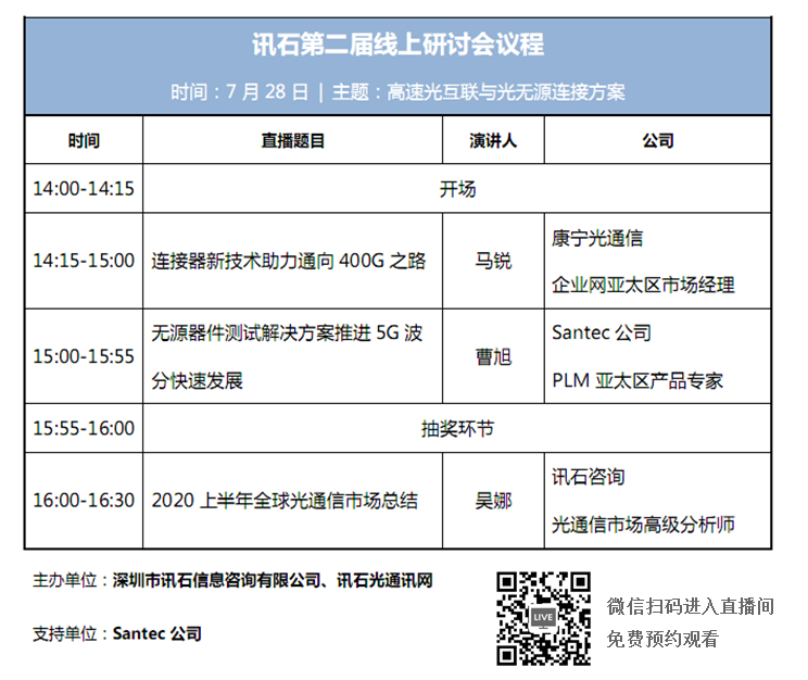 鑒于光纖通信應用需求演變,光纖連接技術重要性日益提升。訊石將于7月28日隆重推出第二屆線上研討會—“探討高速光互聯(lián)與光無源連接方案”,圍繞新一代5G和數(shù)據(jù)中心光網(wǎng)絡的高速光互聯(lián)和光無源連接方案,探討各類小型化、高密度、波分復用的光纖連接價值,誠邀美國康寧光通信、日本Santec公司等光通信專家分享光通信市場最新形勢,介紹5G和數(shù)據(jù)中心高速光互聯(lián)發(fā)展,波分復用和無源產(chǎn)品需求變化。