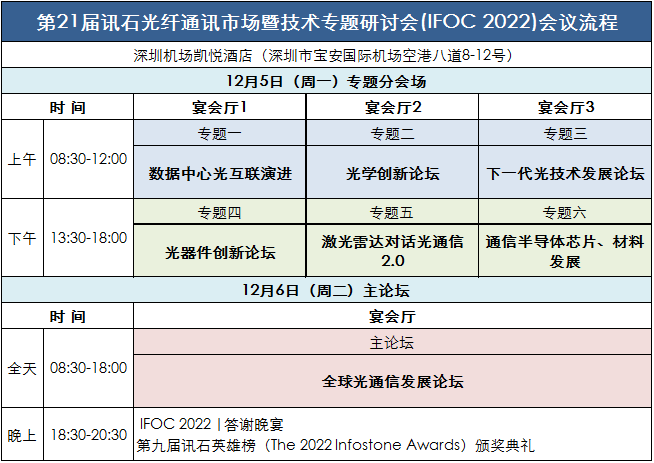 2022年12月5-6日,第21屆訊石光纖通訊市場暨技術(shù)專題研討會(The 21st Infostone Optical Communication Market and Technology Conference,簡稱“IFOC”、“訊石研討會”)邀您共聚深圳機場凱悅酒店(地址:深圳市寶安國際機場空港八道8-12號),從七大專題深入探討覆蓋整個光通訊市場的全面內(nèi)容,層層遞進式分析技術(shù)發(fā)展趨勢,深度融入熱點話題為行業(yè)發(fā)展注入新鮮力量。