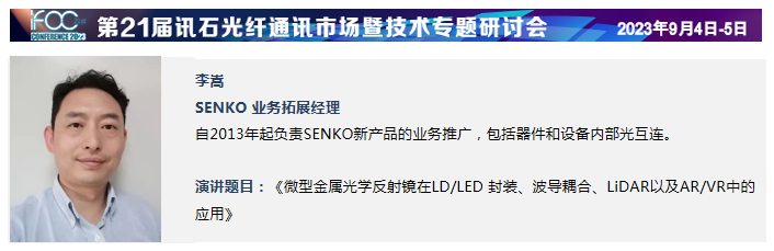 屆時(shí),扇港元器件有限公司(SENKO)業(yè)務(wù)拓展經(jīng)理李嵩將在第21屆訊石研討會(huì)上9月4日專題六《通信半導(dǎo)體芯片、材料發(fā)展》發(fā)表主題為《微型金屬光學(xué)反射鏡在LD/LED 封裝、波導(dǎo)耦合、LiDAR以及AR/VR中的應(yīng)用》的演講,SENKO收購(gòu)了光學(xué)領(lǐng)域的精密沖壓公司Cudoform, 并整合其產(chǎn)品技術(shù)為金屬光學(xué)平臺(tái)。該技術(shù)平臺(tái)使用開(kāi)創(chuàng)性的沖壓技術(shù),可在金屬表面形成定位結(jié)構(gòu)和光反射曲面。定位結(jié)構(gòu)支持亞微米級(jí)光纖定位或無(wú)源耦合。反射面粗糙度為數(shù)納米,可實(shí)現(xiàn)光束自由整形和轉(zhuǎn)向。本次演講介紹該技術(shù)平臺(tái)的原理和歷史, 并報(bào)告其產(chǎn)品在不同領(lǐng)域的應(yīng)用情況。
