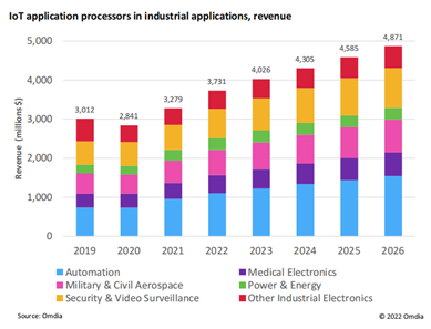 工業(yè)中應(yīng)用處理器增長穩(wěn)定,自動化是其最大細(xì)分市場:盡管市場規(guī)模不大,但工業(yè)市場中物聯(lián)網(wǎng)應(yīng)用處理器的增長更為穩(wěn)定。自2021年起,如果按照規(guī)模計(jì)算,自動化成為其中最大的細(xì)分市場,特別是本地控制機(jī)器人、運(yùn)動控制、人機(jī)界面 (HMI) 和其他添加了計(jì)算能力的領(lǐng)域所取得的進(jìn)步正在推動工業(yè)自動化領(lǐng)域的發(fā)展,還有添加了 AI 和機(jī)器學(xué)習(xí) (ML) 的領(lǐng)域則更需要應(yīng)用處理器來管理收集的數(shù)據(jù),而Omdia也預(yù)計(jì)截止2026年前這一局面將繼續(xù)保持。