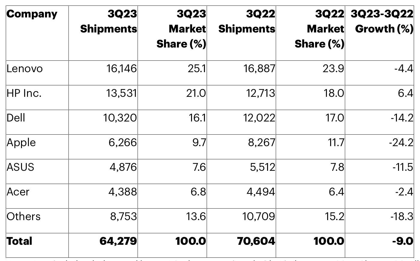 ICC訊 市場研究機構Gartner發(fā)布數(shù)據(jù)顯示,2023年第三季度,全球PC出貨量6428萬臺,同比下降9%,是連續(xù)第八個季度下降。不過相比第一季度的30%、第二季度的16.6%下降,第三季度的降幅持續(xù)縮窄。