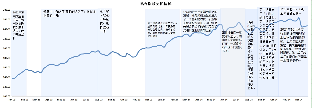 總體來看,12月通信行業(yè)股指呈現(xiàn)先下滑后增長趨勢(shì)。2025年,預(yù)計(jì)在AI的驅(qū)動(dòng)下,相關(guān)企業(yè)仍將保持穩(wěn)定的需求增長,并將在技術(shù)上實(shí)現(xiàn)新的創(chuàng)新突破。